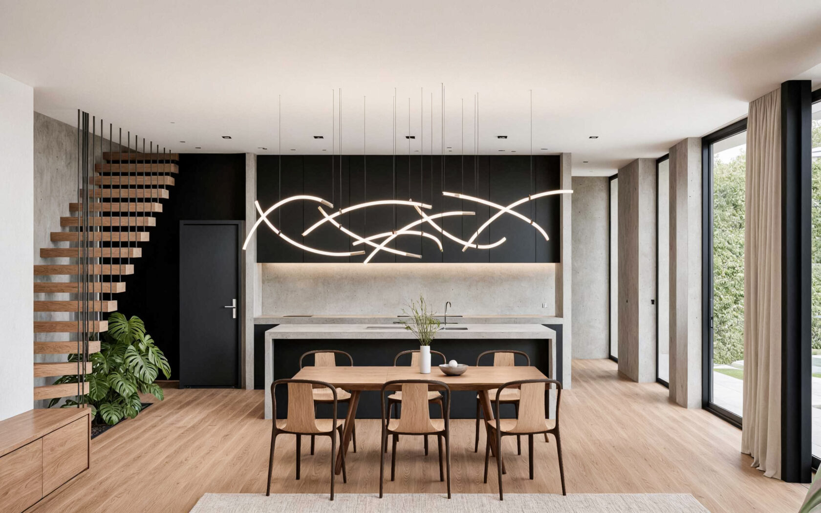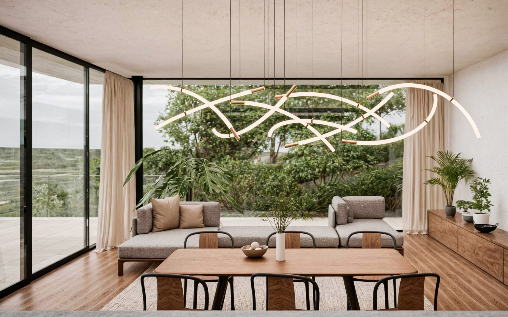 Lineární osvětlení prostor celistvě doplňuje a dodává mu jednotný rámec.
