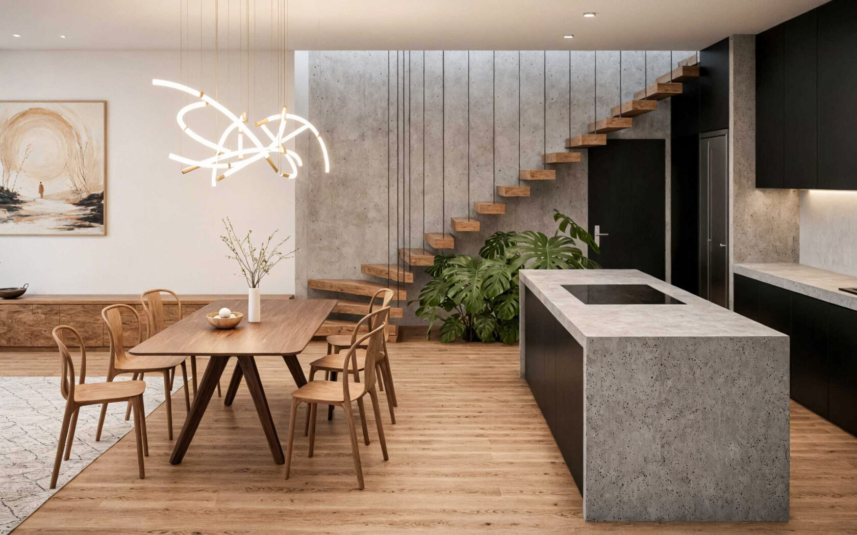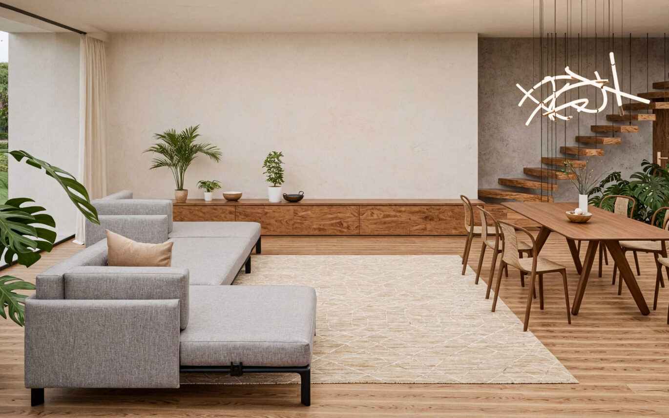 Zvláštní pozornost je věnována propojení obývacího pokoje s kuchyní, kde vzniká prostorný a funkčně otevřený prostor, který nabízí přímý přístup na terasy a vizuální propojení s okolním prostředím. Zvolené luxusní materiály jsou navrženy tak, aby zaujaly i nejnáročnější klientelu.
