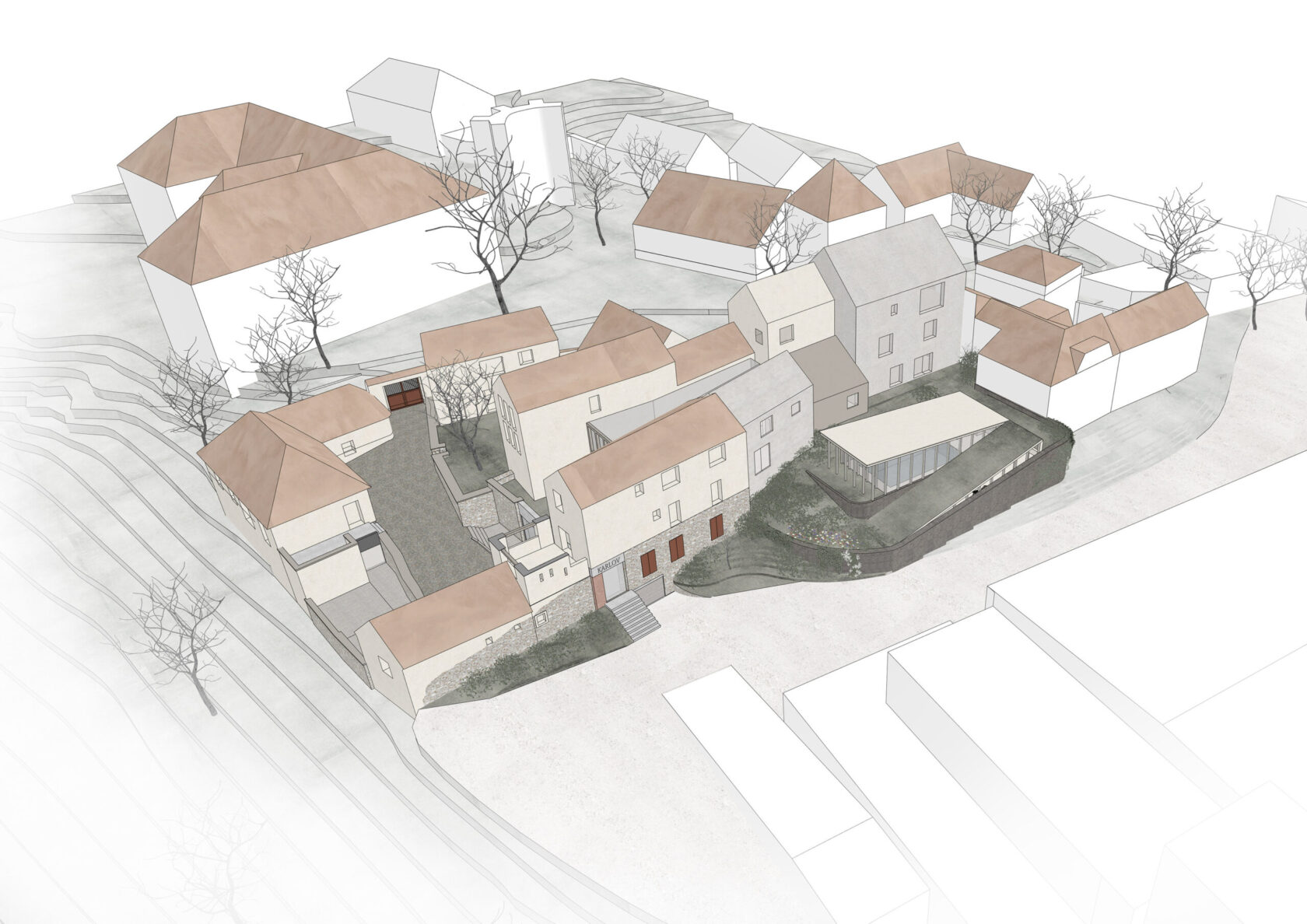 Pro soutěž na dostavbu hotelu Bellevue v Benešově u Prahy jsme navrhli současné rozšíření, které citlivě navazuje na původní koncepci architekta Ladislava Lábuse. Nechtěli jsme vytvářet kontrast za každou cenu – naším cílem bylo doplnit stávající strukturu tak, aby působila přirozeně a respektovala terén návrší Karlov i měřítko okolní zástavby.