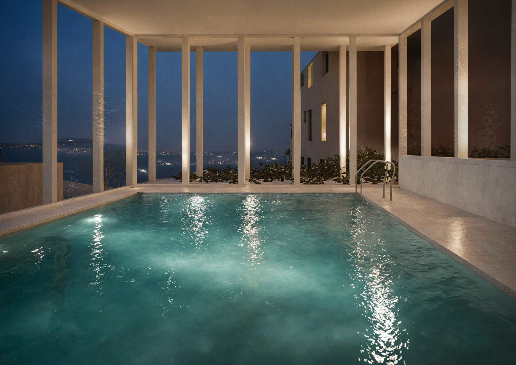 Silným momentem návrhu je wellness centrum s bazénem. Část provozu jsme zapustili do terénu, aby stavba zůstala proporčně uměřená. Recepci, šatny i sprchy prosvětlují horní okna, která zajišťují přirozené světlo i dostatek soukromí. Samotný bazén vystupuje nad terén a otevírá se směrem k městu – nabízí panoramatický výhled, skutečné „bellevue“.