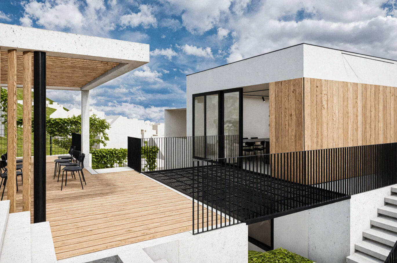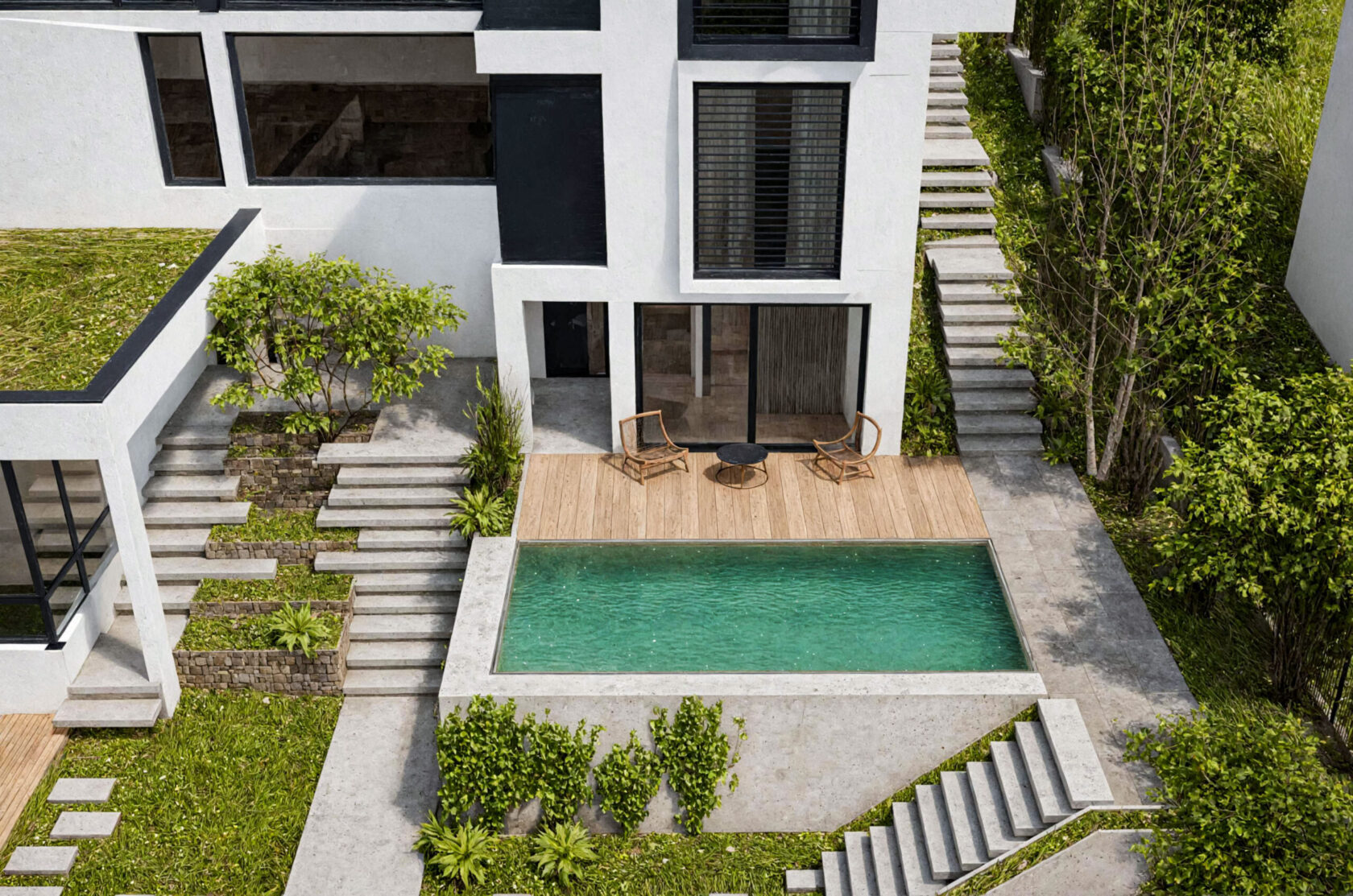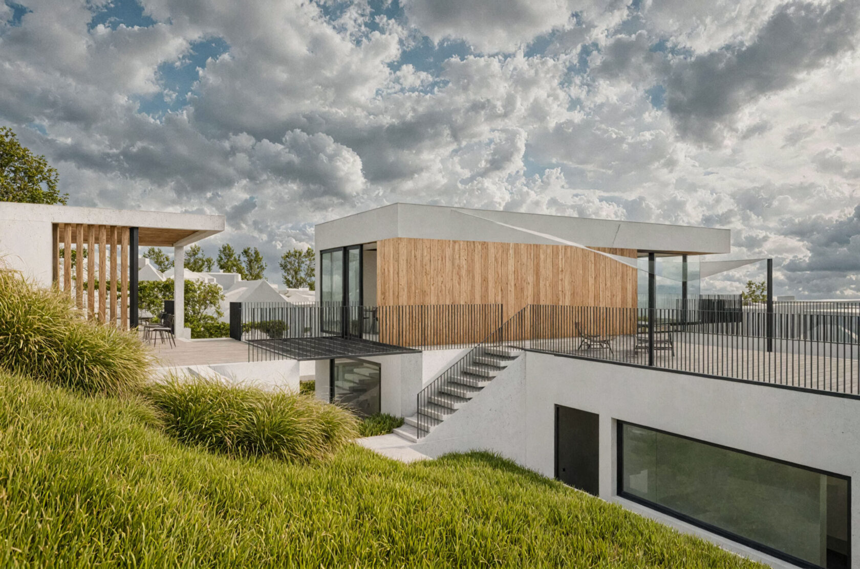 Výhled z parcely je fantastický, směrující přímo na Hradčany, Stromovku a Výstaviště, spolu se zbytkem Prahy. Pozice ve svahu dala prostor vzniku perfektní terásky. Ta připojuje saunovací místnost k venkovnímu sezení, které přirozeně přechází ve velkorysý ocelový bazén (s potěšením ve spolupráci s Aquamarine) usazený v betonovém loži. Svahování se tak řeší prakticky a funkčně.