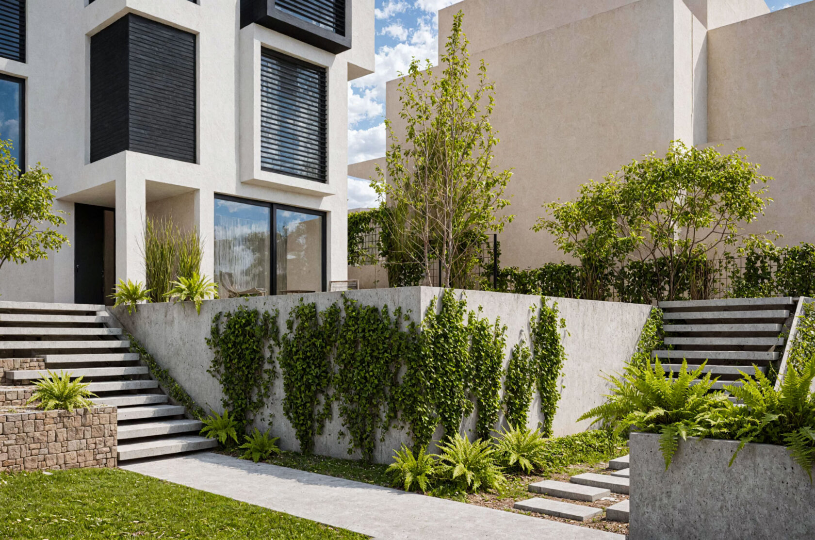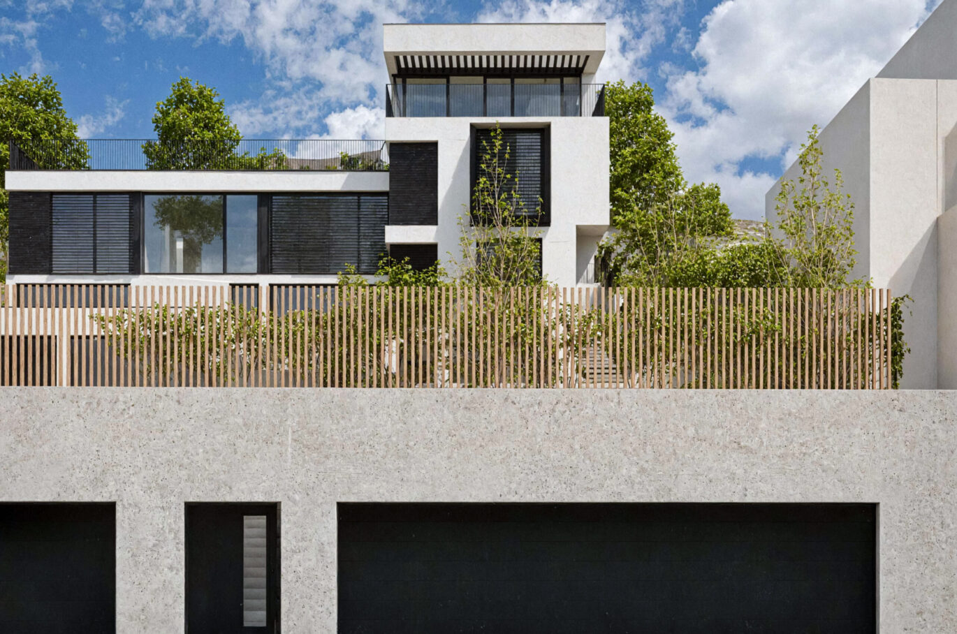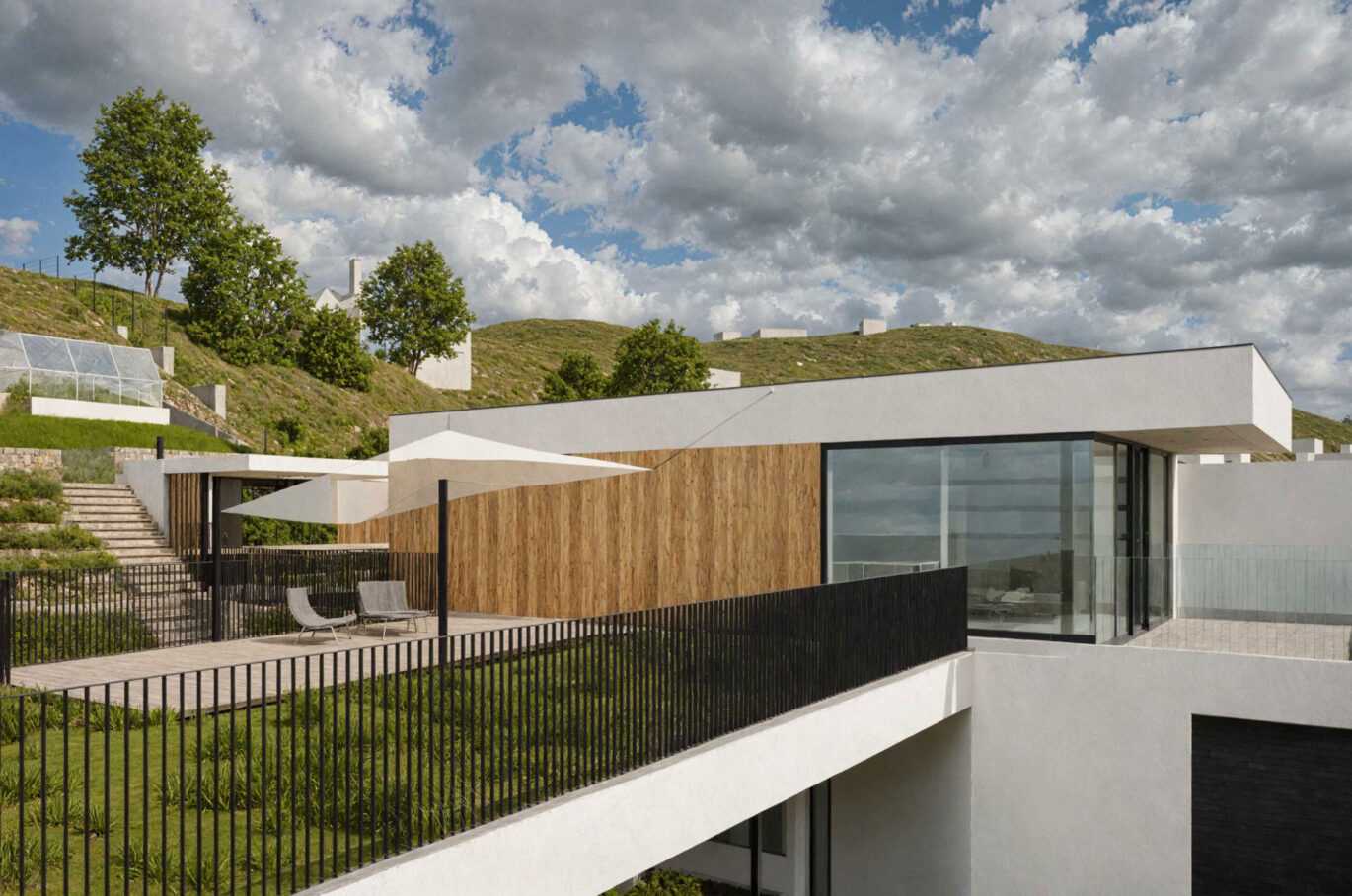 Výhled z parcely je fantastický, směrující přímo na Hradčany, Stromovku a Výstaviště, spolu se zbytkem Prahy. Pozice ve svahu dala prostor vzniku perfektní terásky. Ta připojuje saunovací místnost k venkovnímu sezení, které přirozeně přechází ve velkorysý ocelový bazén (s potěšením ve spolupráci s Aquamarine) usazený v betonovém loži. Svahování se tak řeší prakticky a funkčně.
