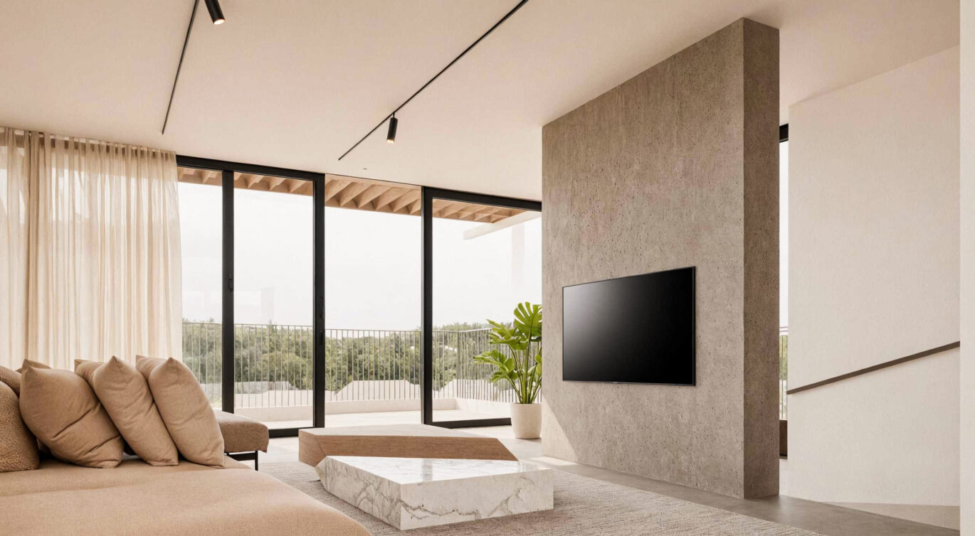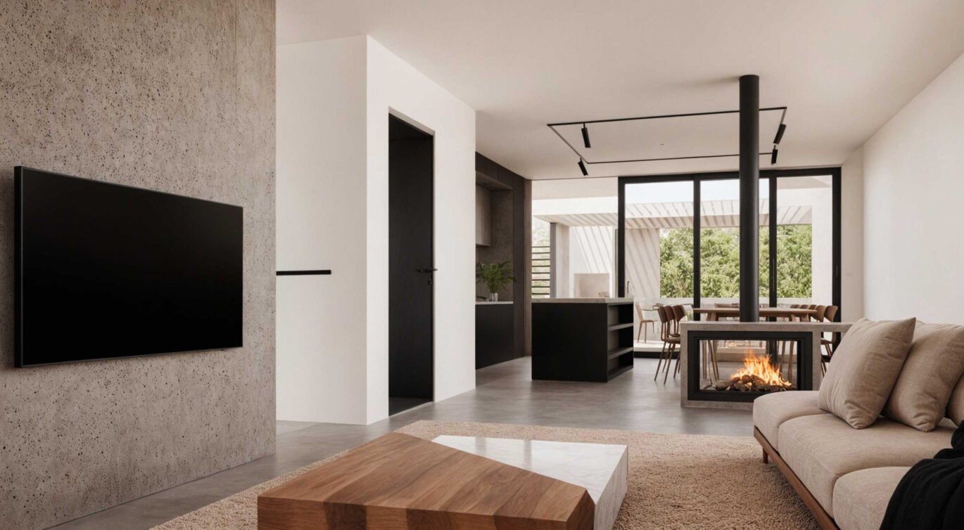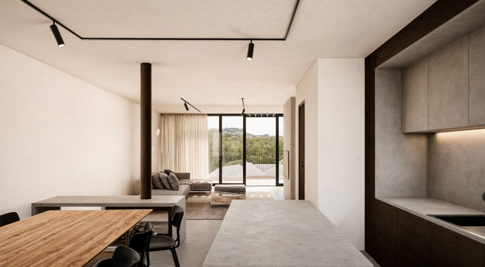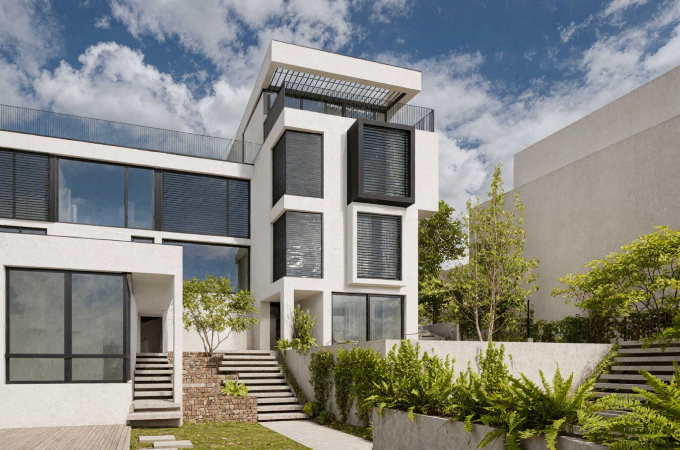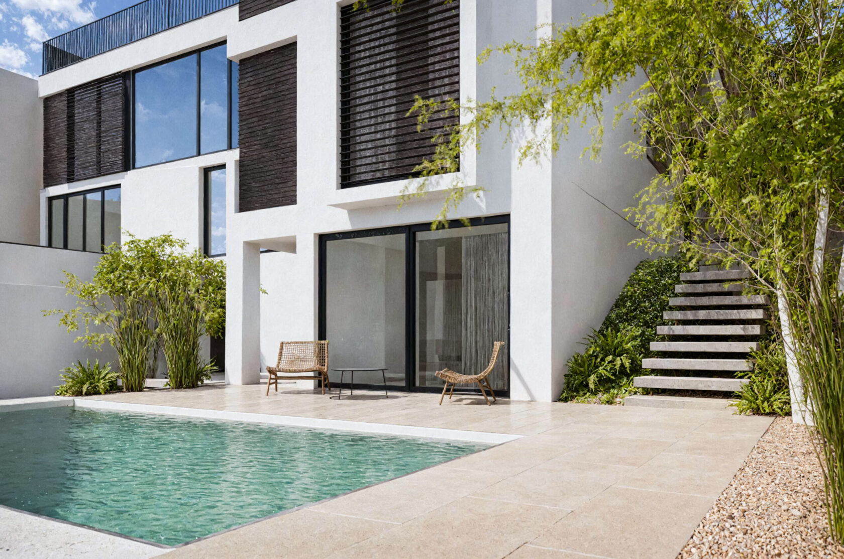 Srovnáním výšek s úrovní místnosti pro saunu se tak nabízí krásná terasa s přímým přístupem k bazénu. Komunikace mezi vnějším a vnitřním je zásadním aspektem projektu vily v Trojské. Z nejvyššího patra je plynulá návaznost na systém teras. Obyvatelé se tak dostanou do letní kuchyně i na střešní terasu po jedné výškové úrovni.
