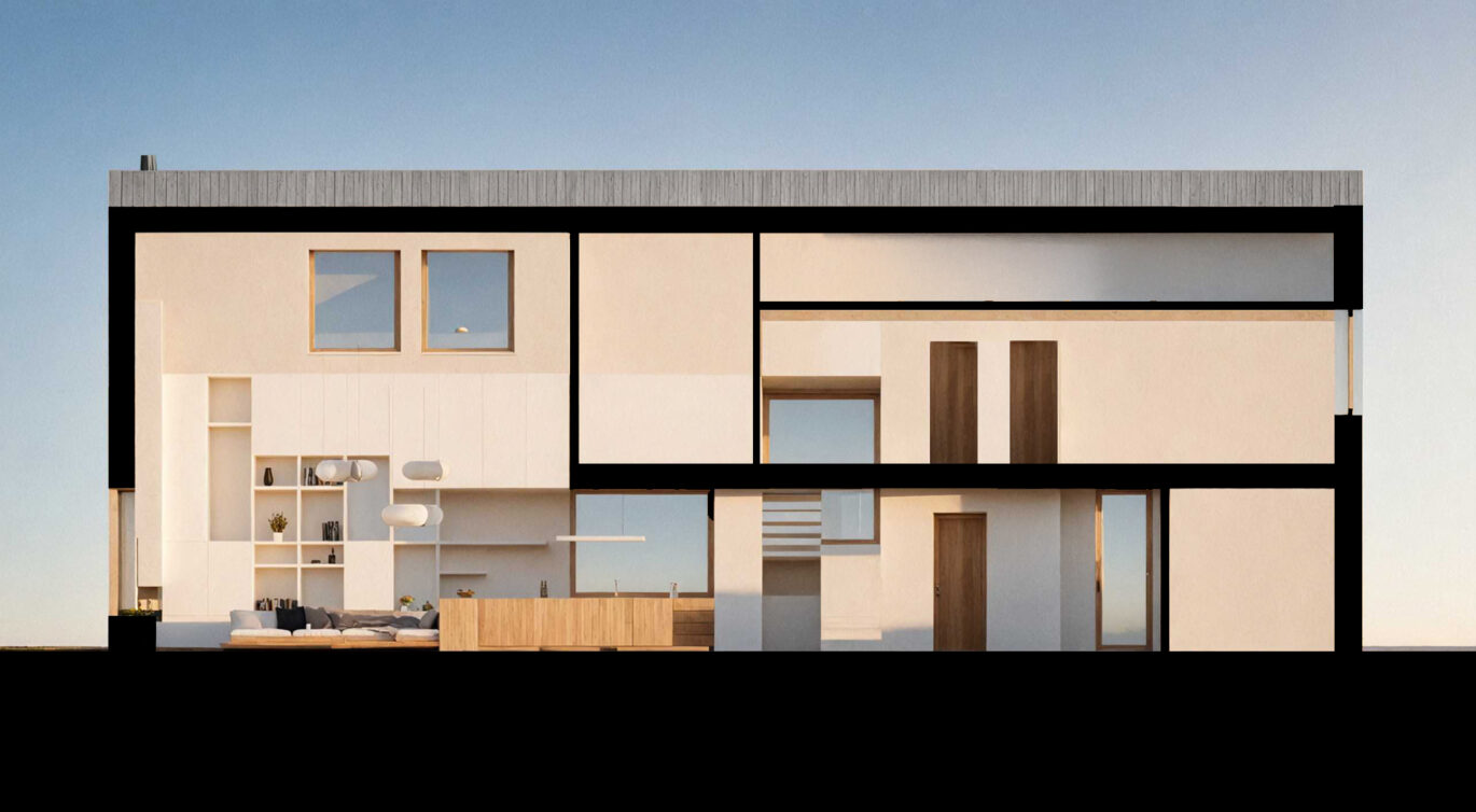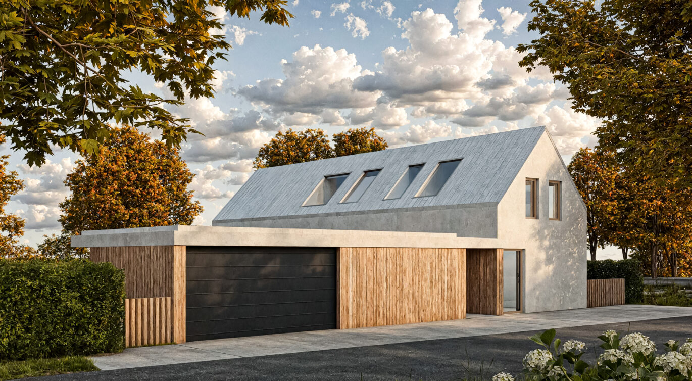 Exteriér domu je tvořen kombinací bílé omítky, přírodního dřevěného obkladu a šedé pozinkované střechy. Stejný jazyk materiálů se propisuje i do interiéru, kde převažuje bílá, světlé dřevo a jemné krémové odstíny. Výraz domu čerpá inspiraci z japonské estetiky – jednoduchost, klid a harmonické propojení s přírodou.