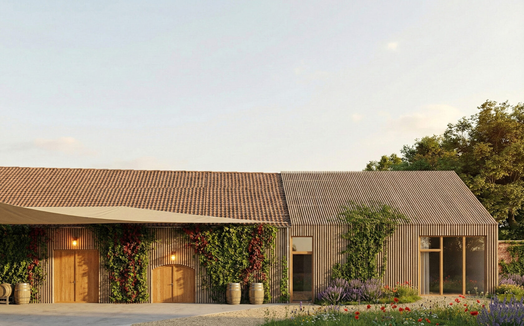 Součástí celku je také novostavba s barem a posezením. Objem této stavby navazuje na přilehlou budovu a jedná se o dřevostavbu, která materiálově vychází ze stodol. Detailní kompoziční prvky jsou však současné, například dřevěný laťový obklad překrývající okenní otvory.
