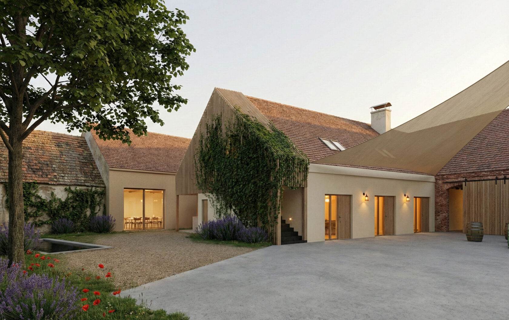 Na dvoře, kde probíhá výroba vína, je jako povrch použit světlý beton. Ostatní povrchové úpravy terénu jsou voleny s ohledem na venkovský charakter místa – zahrnují mlat, trávu nebo štěrk s trávou.