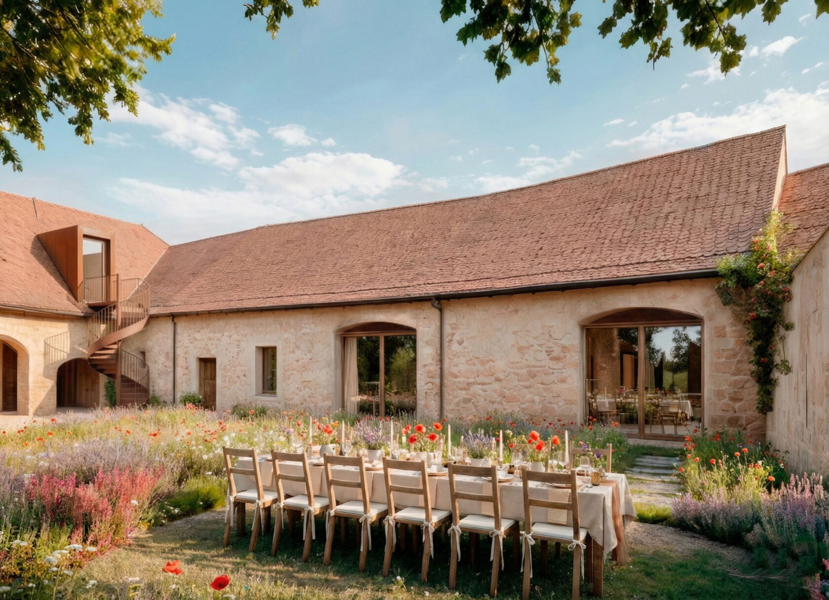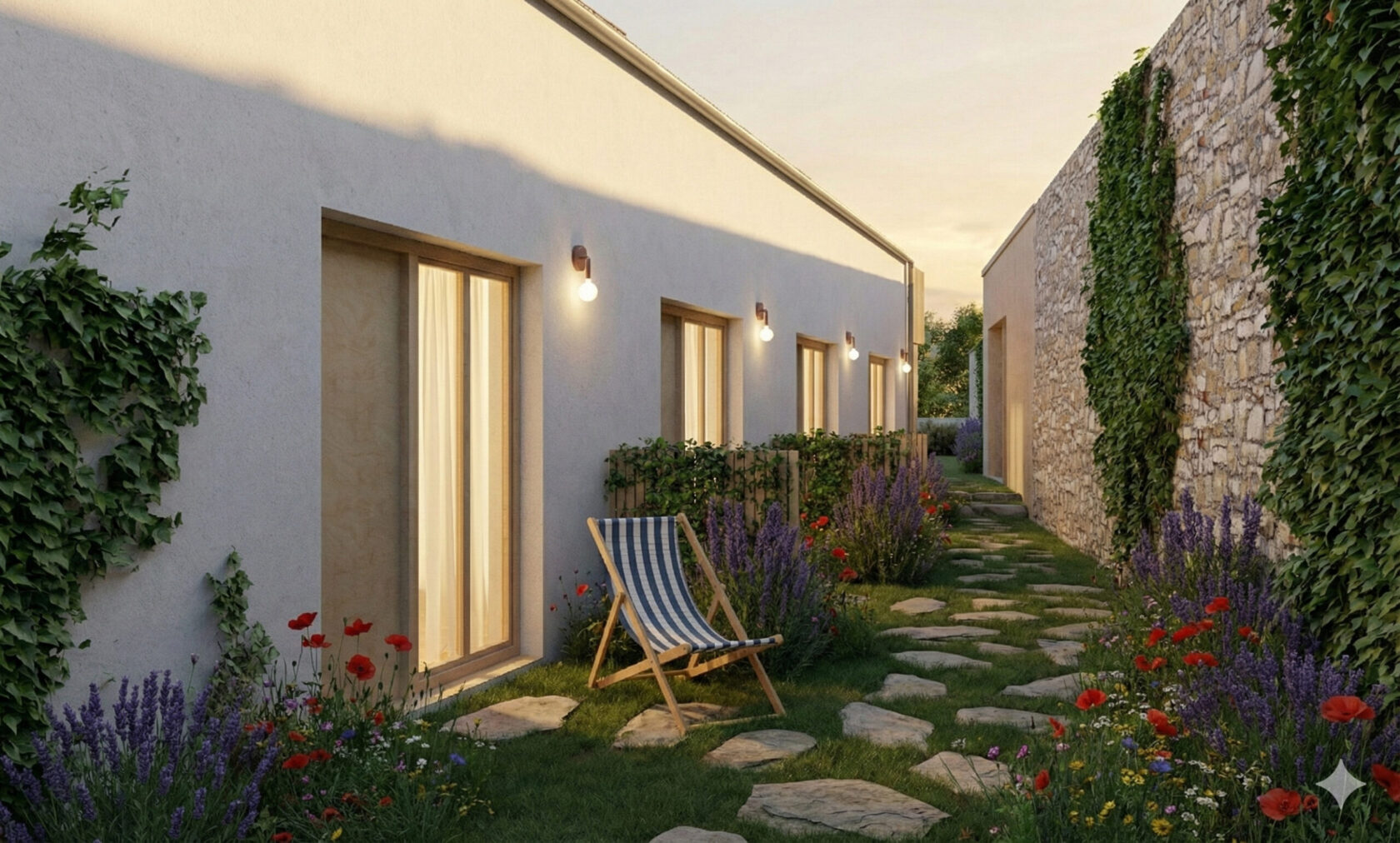 Okenní a dveřní otvory jsou vyrobeny ze světlého dřeva. Omítky jsou tradiční vápenné s jemnou strukturou a ve světlých odstínech od bílé po béžovou. Některé stěny v exteriéru a interiéru jsou otlučeny na kámen, čímž se zachovává autentický venkovský charakter usedlostí.