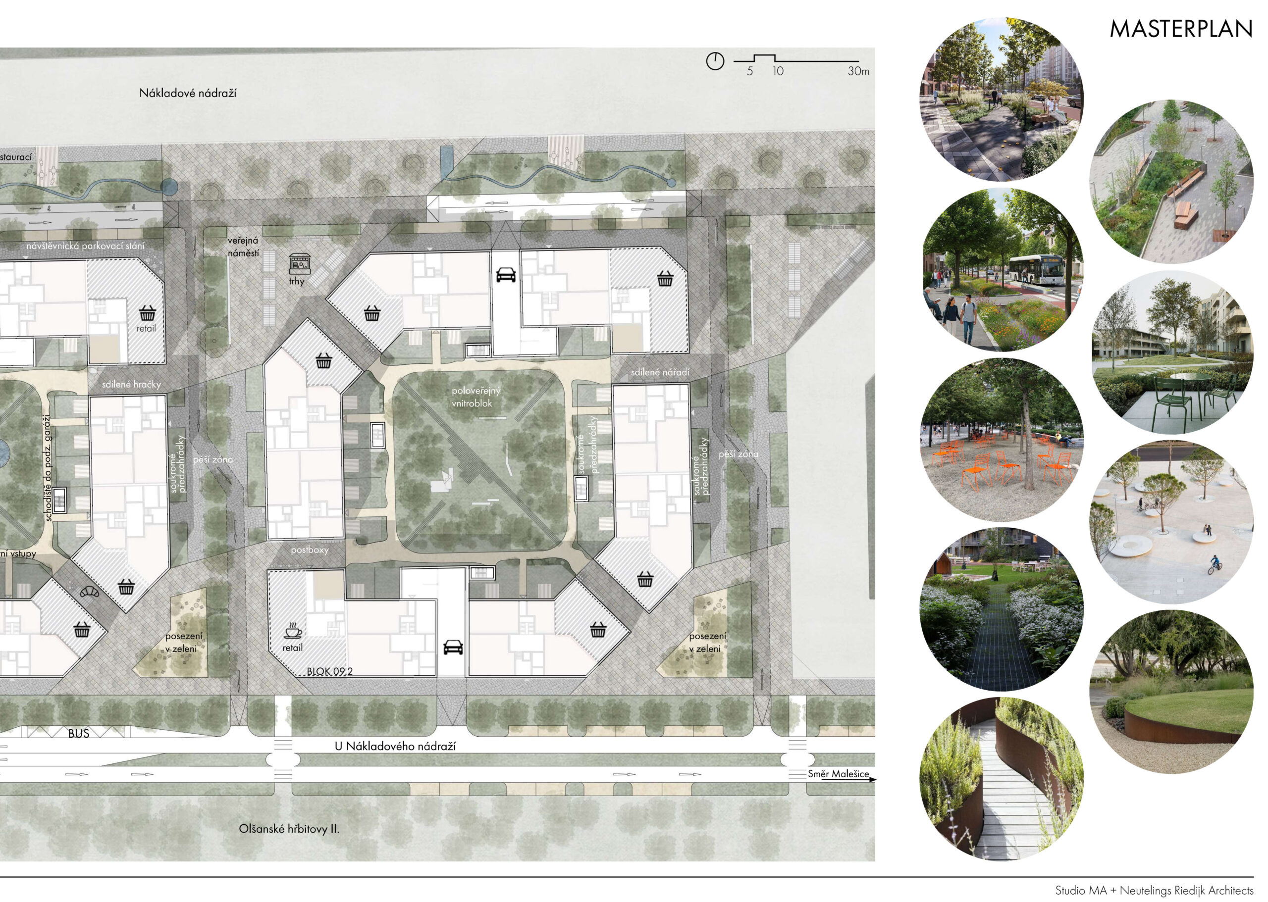 vizuálním průhledům, jež propojují bývalé nákladové nádraží, tramvajovou zastávku, hřbitovní zeleň a vnitroblokovou zahradu,